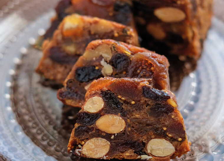 Hachez grossièrement les noix, les amandes et les noisettes. Coupez en petits dés les écorces d’orange et de citron confites.