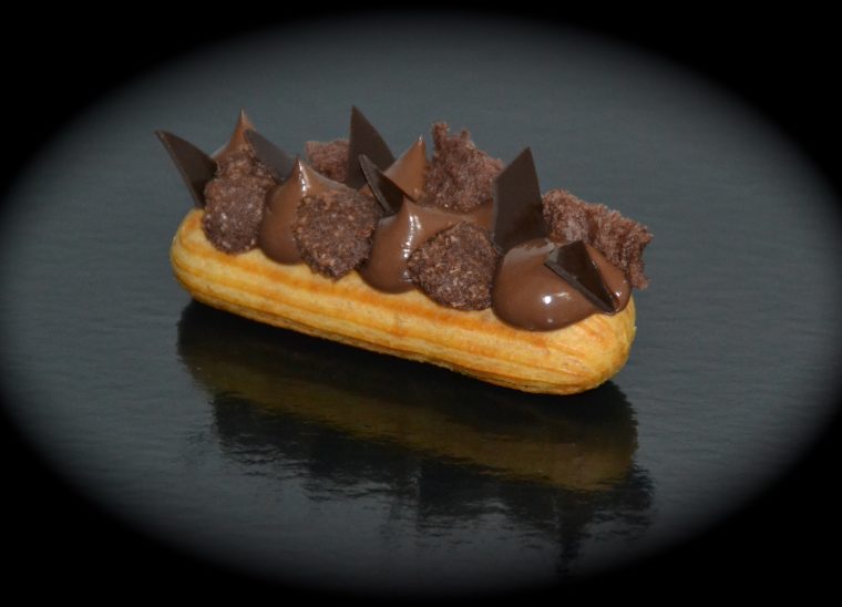 Couper le haut de l’éclair et garnir par couches successives avec du crémeux, du croustillant, de la gelée et du crémeux.