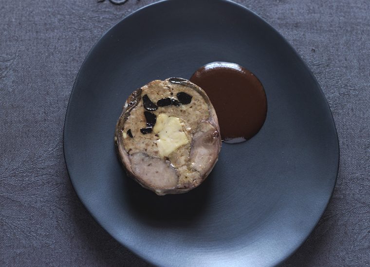 Egoutter la viande et les intérieurs du lièvre de la marinade. Hacher fin le filet de porc, le foie de volaille, les poumons, le cœur et les débris de chair de lièvre. Ciseler l’échalote et la faire fondre avec le lard gras, ajouter les cèpes tailler en duxelles. Laisser refroidir et ajouter la farce. Tailler les truffes en gros dés, ajouter à la farce. Mettre ce hachis dans la cuve du batteur. Ajouter les œufs, les aromates en poudre, le sel, le poivre moulu, les quatre-épices. Mouiller avec l’armagnac et mélanger doucement. Etaler le lièvre désossé sur le dos ; enlever la chair des cuisses et la repartir sur les parties les moins charnues du lièvre. Tapisser tout l’intérieur avec une partie de la farce. Garnir avec le foie gras escalopé et couvrir avec le reste de la farce. Rouler le lièvre en lui donnant une belle forme ronde et l’envelopper entièrement de crépine de porc. Assaisonner de sel et de poivre du moulin et placer le lièvre dans un sac sous vide rétractable avec 10 cl de sauce. Cuire par immersion 36 heures à une température ambiante de 68°C.