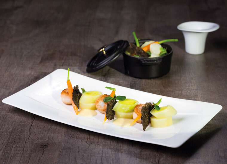 Noix de Saint Jacques poêlées servies en cocotte, dans l’esprit d’un « Baeckaoffa », copeaux de truffe