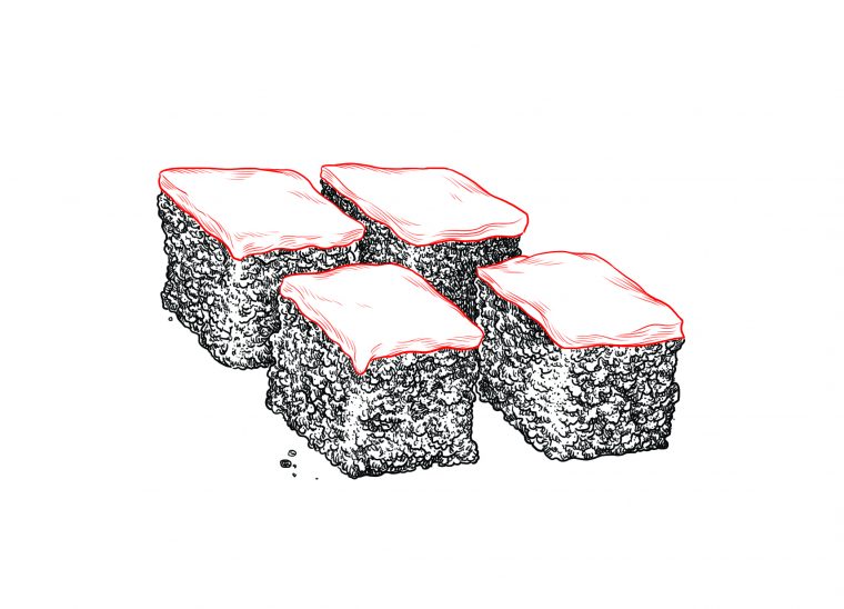 Lorsque le glaçage au kirsch est totalement pris, découper le gâteau en petites bouchées rectangle de 5 cm sur 2,5 cm.