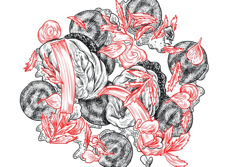 Mélanger le jus de rhubarbe et le miel, faire réduire le jus de moitié puis monter avec l’huile de tagète. Assaisonner.