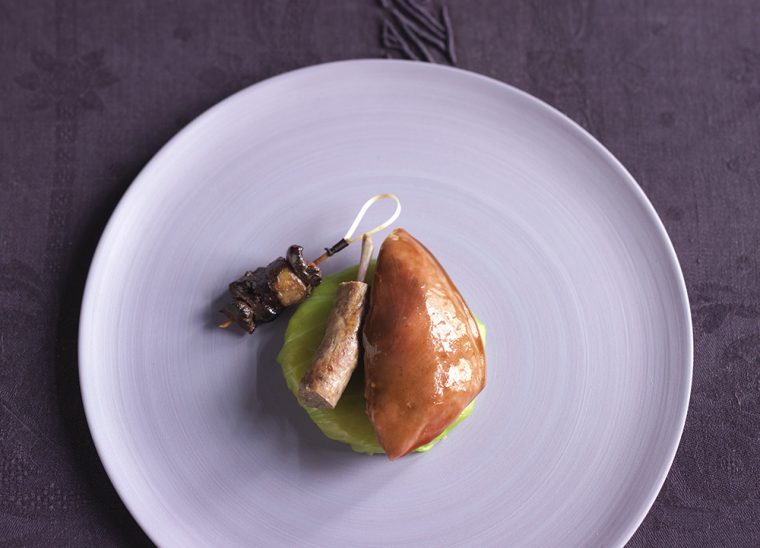 Confectionner 4 brochettes avec les abatis de pigeons en intercalant un morceau de foie gras cru, ½ cœur, ½ foie ainsi qu’ ½ gésier.