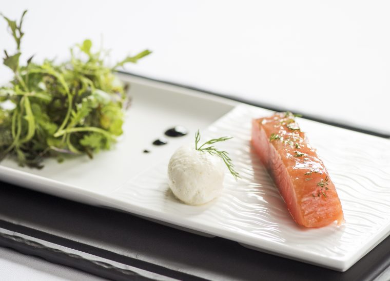 Saumon mariné au fenouil et poivre en grain, crème de raifort