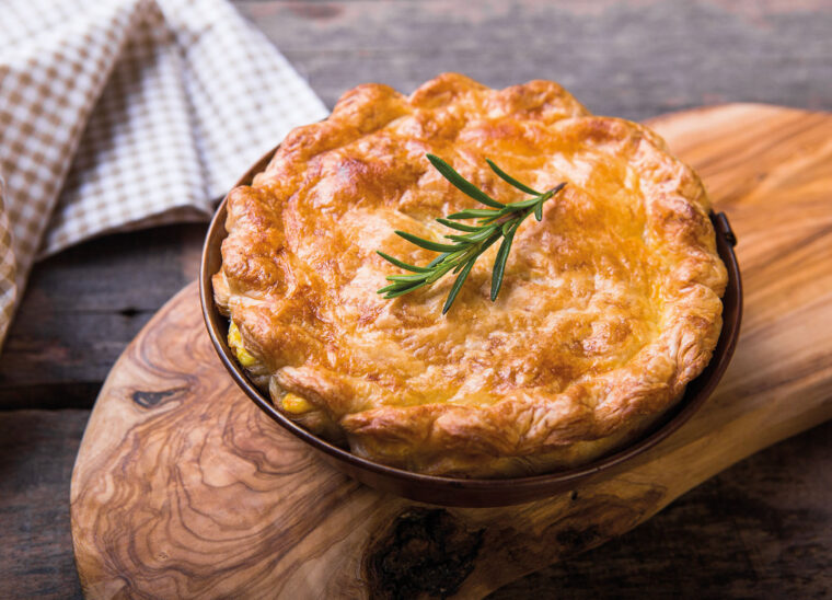 Poser la pâte feuilletée sur la farce et la souder avec la pâte brisée en appuyant avec l’index après avoir coupé le surplus de pâte brisée.
